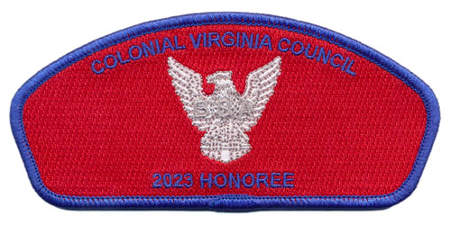 The 2016 Eagle Banquet patch is an oversized CSP featuring a flying eagle. The patch was designed by Elizabeth Burtner and honors the Hugh C. Ewing Jr. Eagle Class of 2015.