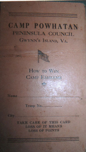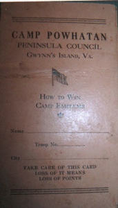 Newport News Council was the name of Peninsula Council from 1918 to 1929. There were two camps, Camp Powhattan (yes, two "t's") and Camp Washington. Camp Powhattan was in existence from 1919 to 1946, Camp Washington was in existence from 1919 through 1932, but Peninsula Scouts attended only through 1929. Washington was the larger of the two camps, and also served the Norfolk Council and the Portsmouth Council (later, together, the Tidewater Council). Camp Washington was owned by Newport News Council. Camp Powhattan was owned by the Newport News Council at first, then sold to the Roanoke Council (later Blue Ridge Council) in 1926. Roanoke Council operated Powhattan for another 20 years. During the 1929 through 1935 period, Scouts from the Peninsula attended summer camp there following the sale of Camp Washington to Norfolk Council in 1929. |